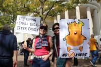 People held signs, others were dressed as dinosaurs, frogs and unicorns. One group broke out into a dance party to a musical mix of the Gloria Gaynor classic "I Will Survive" in front of the Department of Labor — which has been adorned with a giant banner of U.S. President Donald Trump's face.