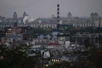 Smoke bellows in the background at dusk in Kyiv, Ukraine, Tuesday, Oct. 21, 2025. (AP Photo/Julia Demaree Nikhinson)