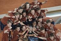 Winner Coco Gauff of the U.S. and ball boys and girls pose with the trophy after the final match of the French Tennis Open against Aryna Sabalenka of Belarus at the Roland-Garros stadium in Paris, Saturday, June 7, 2025. (AP Photo/Christophe Ena)