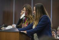 Jeanne Pepper, left, mother of Blaze Bernstein, wipes away tears as she gives a victim impact statement in court in Santa Ana, Calif., Friday, Nov. 15, 2024, prior to sentencing of Samuel Woodward, who was convicted of a hate crime murder for the killing of former classmate Blaze Bernstein. Senior Deputy District Attorney Jennifer Walker stands at right. (Mark Rightmire/The Orange County Register via AP, Pool)