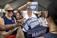 Supporters for democratic presidential nominee Vice President Kamala Harris grab fans to try to stay cool outside a campaign event, Thursday, Aug. 29, 2024, in Savannah, Ga. (AP Photo/Stephen B. Morton)