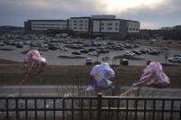 Balloons are placed in front of UPMC Memorial Hospital after a deadly shooting in York, Pa. on Saturday, Feb. 22, 2025. (AP Photo/Matt Rourke)