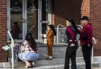 Leah Fauth gets emotional after leaving flowers in front of the West York Police Department after a police officer was killed responding to a shooting at UPMC Memorial Hospital in York, Pa. on Saturday, Feb. 22, 2025. (AP Photo/Matt Rourke)