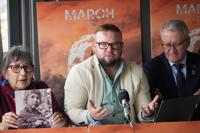 Evelyn Korkmaz, left, Gemma Hickey, center, and Matthias Katsch, with Ending Clergy Abuse, a global organization of abuse victims and activists, hold a press conference after a meeting with Pope Leo XIV at the Vatican, in Rome, Monday, Oct. 20, 2025. (AP Photo/Andrew Medichini)